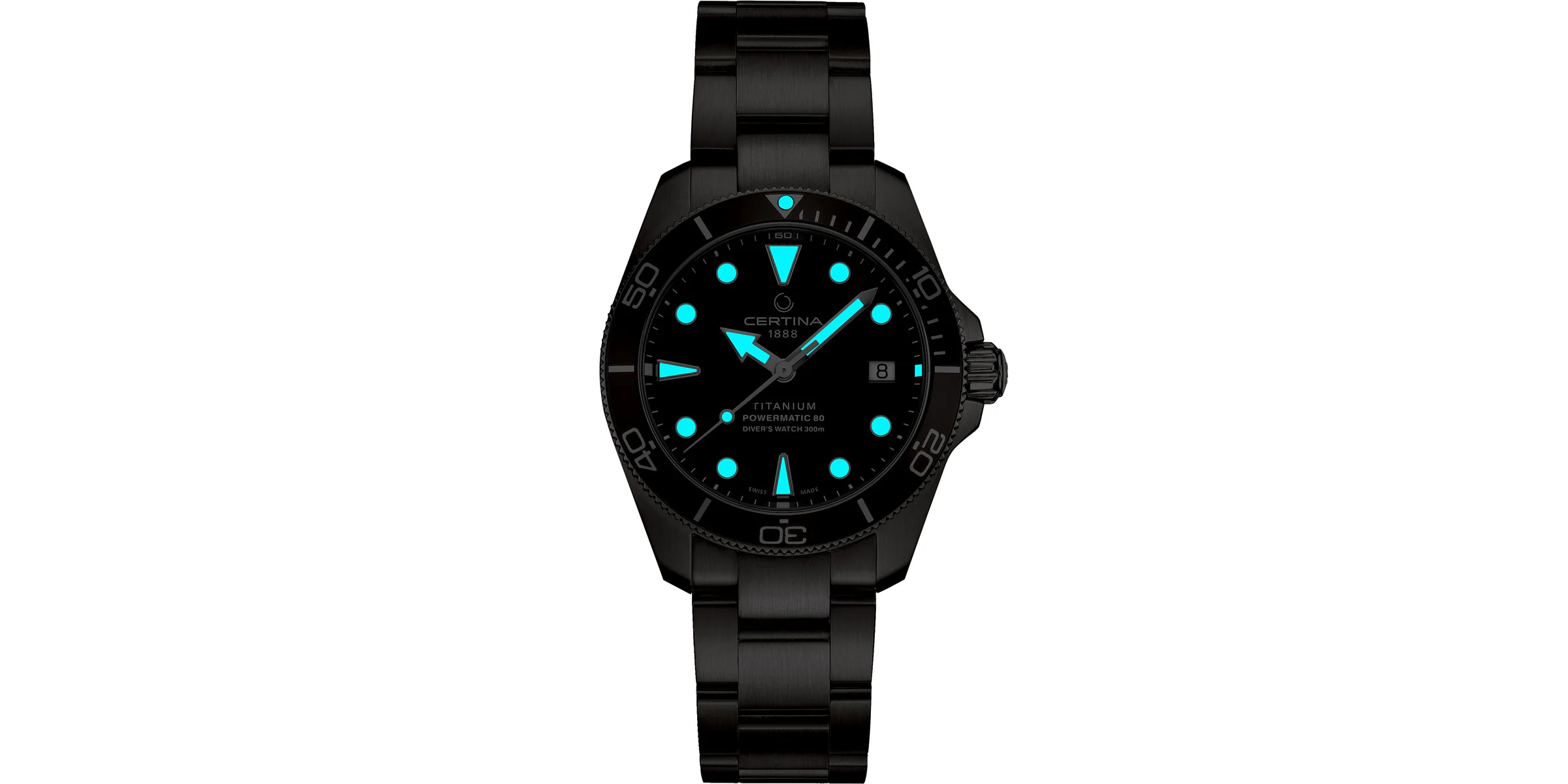 Super-Luminova® (SLN) est un matériau phosphorescent. Le type SLN BG W9 utilisé par Certina Émet la lumière stockée comme une lueur bleuâtre dans l'obscurité. Le SLN est inoffensif à la santé et est utilisé pour enrober les mains, les index et les lunettes. Sa luminosité diminue après un certain temps dans l'obscurité, mais est automatiquement rechargé par la lumière.